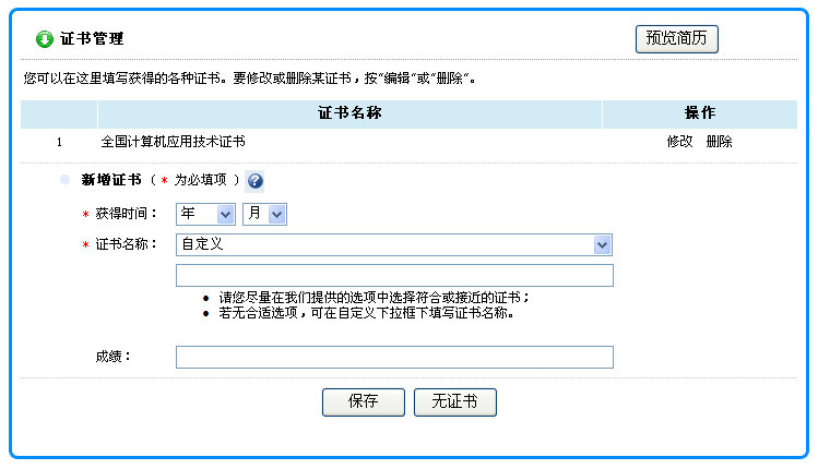 1)進(jìn)入"個(gè)人管理中心",位于左側(cè)子欄目的"簡(jiǎn)歷維護(hù)",點(diǎn)擊"個(gè)人證書管理"。